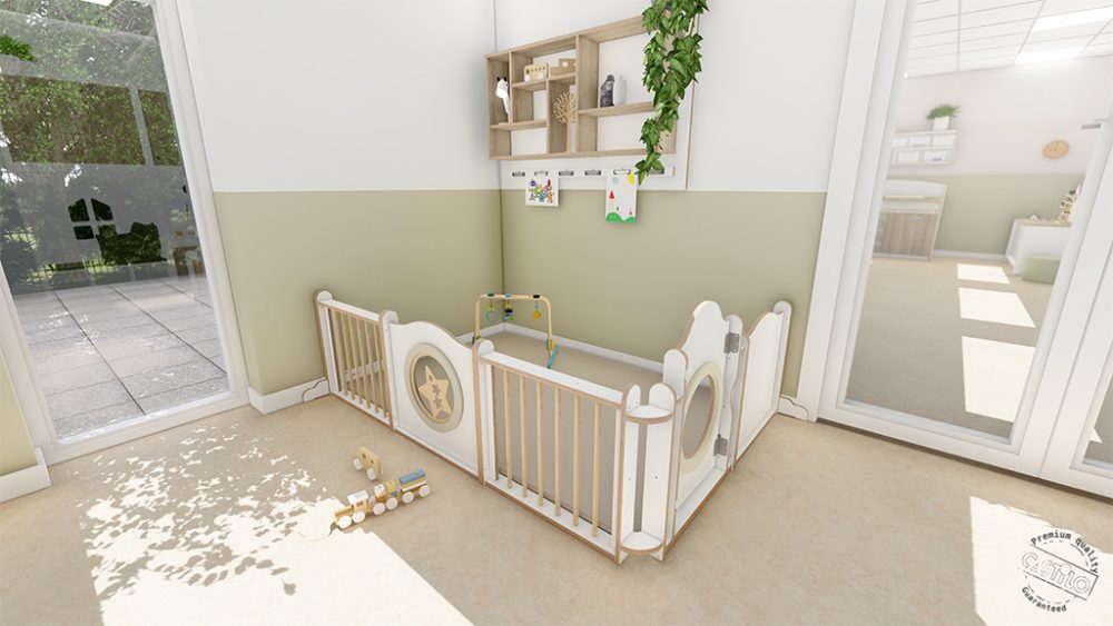 In de grondbox kunnen oudere baby’s — te groot voor de gewone box maar nog niet klaar om vrij op de groep te spelen — zich in alle vrijheid bewegen en ontdekken. Vanuit liggen rollen ze om, gaan tijgeren en leren kruipen. Dit zelfstandig bewegen heeft een positieve invloed op het zelfvertrouwen en zelfbeeld van het kind. Tegelijk creëert de grondbox rust op de groep: baby’s worden niet meer gehinderd door grotere kinderen en andersom. Het ergonomische deurtje opent door het op te tillen en zo uit de vergrendeling te halen — u hoeft niet te bukken om het deurtje te openen of te vergrendelen. De lage drempel zorgt ervoor dat u kinderen eenvoudig in en uit de box kunt tillen.