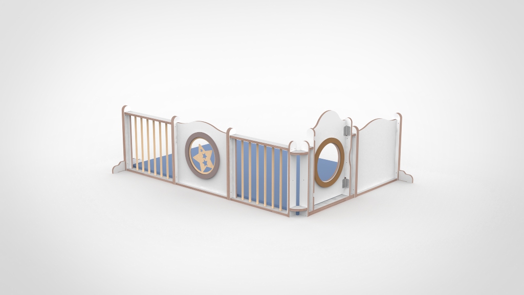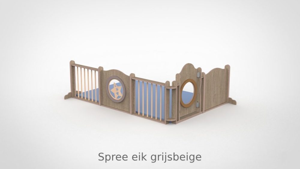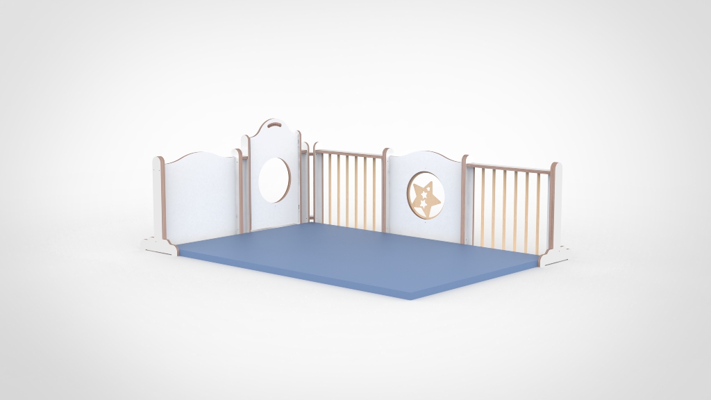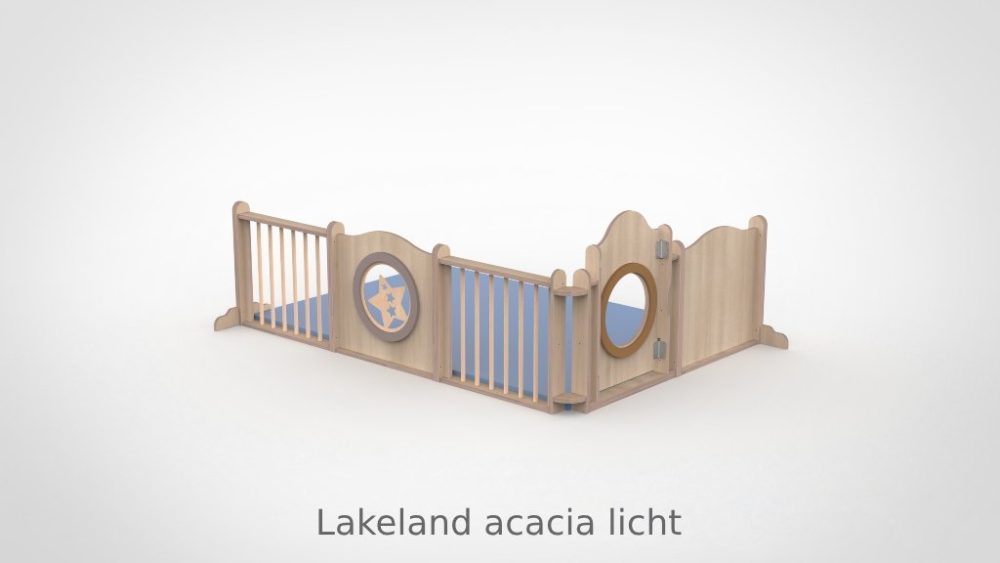 De panelen zijn opgebouwd uit 15 mm berken multiplex met aan beide kanten een slijtvast HPL in wit of in een van de 8 beschikbare houtdecors. De decoratieve ringen in de panelen zijn verkrijgbaar in meer dan 30 kleuren, gespoten in onze eigen spuiterij — zo stemt u de grondbox perfect af op de uitstraling van uw groepsruimte. De ronde kijkgaten zijn voorzien van transparant plexiglas, veilig en kindvriendelijk. Alle panelen zijn ontworpen met het voorkomen van beknelling van hoofd en vingers als uitgangspunt. De ondergrond mag gewoon de vloer zijn: baby’s kunnen zich hier het beste tegen afzetten om te oefenen in allerlei posities. Optioneel levert Castilo een mat op maat, vervaardigd in ons eigen stoffeeratelier uit hoogwaardig kunstleder — ademend, waterdicht en slijtvast — in talloze kleuren en materialen.