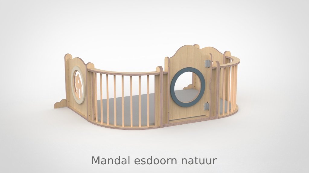 De panelen zijn opgebouwd uit 15 mm berken multiplex met aan beide kanten een slijtvast HPL in wit of in een van de 8 beschikbare houtdecors. De decoratieve ringen in de panelen zijn verkrijgbaar in meer dan 30 kleuren, gespoten in onze eigen spuiterij — zo stemt u de grondbox perfect af op de uitstraling van uw groepsruimte. De ronde kijkgaten zijn voorzien van transparant plexiglas, veilig en kindvriendelijk. Alle panelen zijn ontworpen met het voorkomen van beknelling van hoofd en vingers als uitgangspunt. De ondergrond mag gewoon de vloer zijn: baby’s kunnen zich hier het beste tegen afzetten om te oefenen in allerlei posities. Optioneel levert Castilo een mat op maat, vervaardigd in ons eigen stoffeeratelier uit hoogwaardig kunstleder — ademend, waterdicht en slijtvast — in talloze kleuren en materialen.