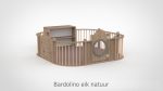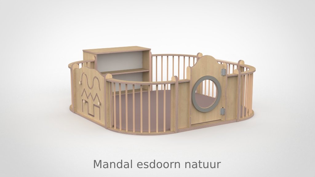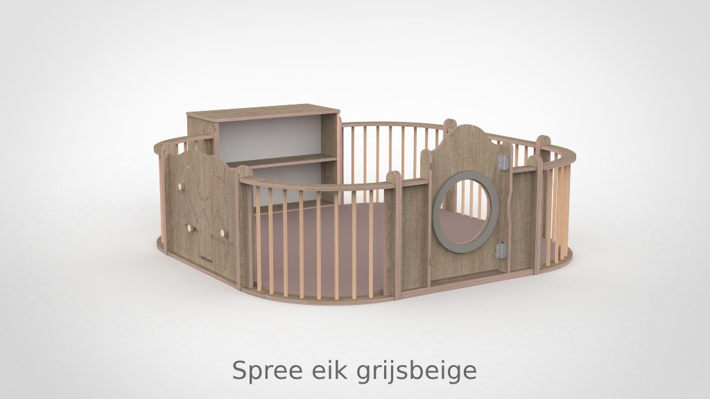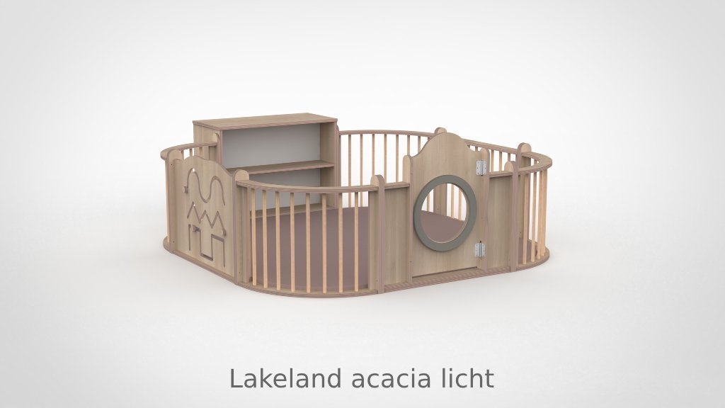 De panelen zijn opgebouwd uit 15 mm berken multiplex met aan beide kanten een slijtvast HPL in wit of in een van de 8 beschikbare houtdecors. De decoratieve ringen in de panelen zijn verkrijgbaar in meer dan 30 kleuren, gespoten in onze eigen spuiterij — zo stemt u de grondbox perfect af op de uitstraling van uw groepsruimte. De ronde kijkgaten zijn voorzien van transparant plexiglas, veilig en kindvriendelijk. Alle panelen zijn ontworpen met het voorkomen van beknelling van hoofd en vingers als uitgangspunt. De ondergrond mag gewoon de vloer zijn: baby’s kunnen zich hier het beste tegen afzetten om te oefenen in allerlei posities. Optioneel levert Castilo een mat op maat, vervaardigd in ons eigen stoffeeratelier uit hoogwaardig kunstleder — ademend, waterdicht en slijtvast — in talloze kleuren en materialen.