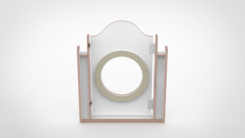 In een drukke groepsruimte telt elke handeling. Het optilmechanisme is snel en intuïtief voor alle medewerkers, maar voor kinderen niet te openen. De ronde kijkopening is voorzien van gerecycled plexiglas, zodat baby’s naar buiten kunnen kijken en leidsters goed zicht houden. Optioneel plaatsen wij een decoratieve silhouette tussen twee lagen plexiglas — veilig ingesloten en niet aanraakbaar.