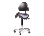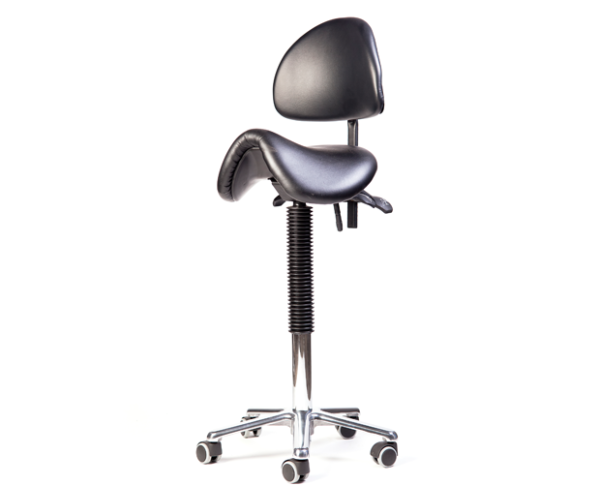 Ergonomische zadelkruk met rugleuning voor extra steun. Combineert actief zitten met de ondersteuning van een rugleuning.