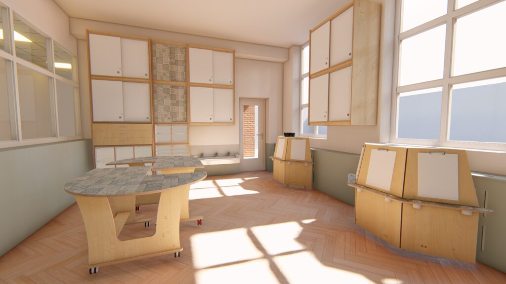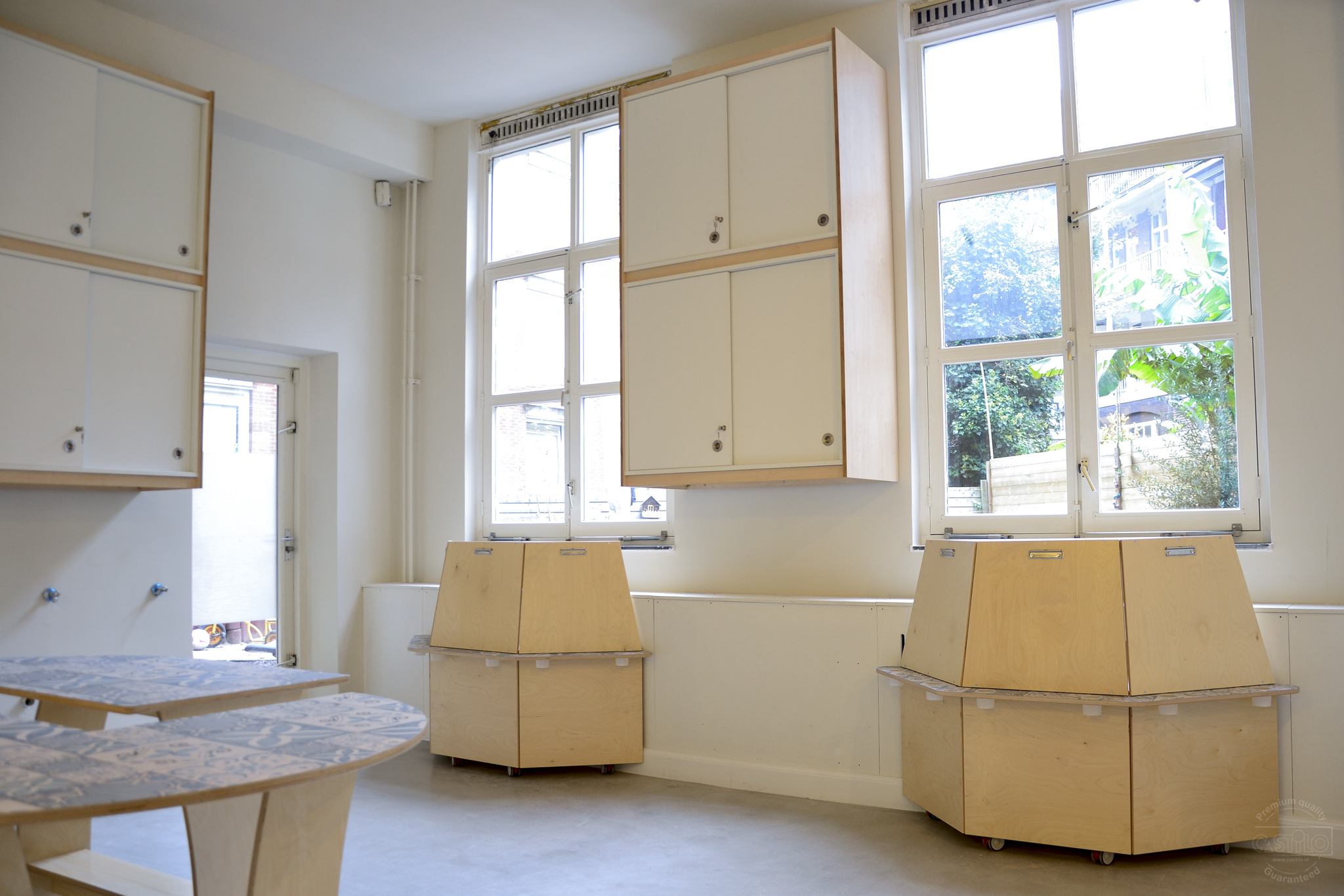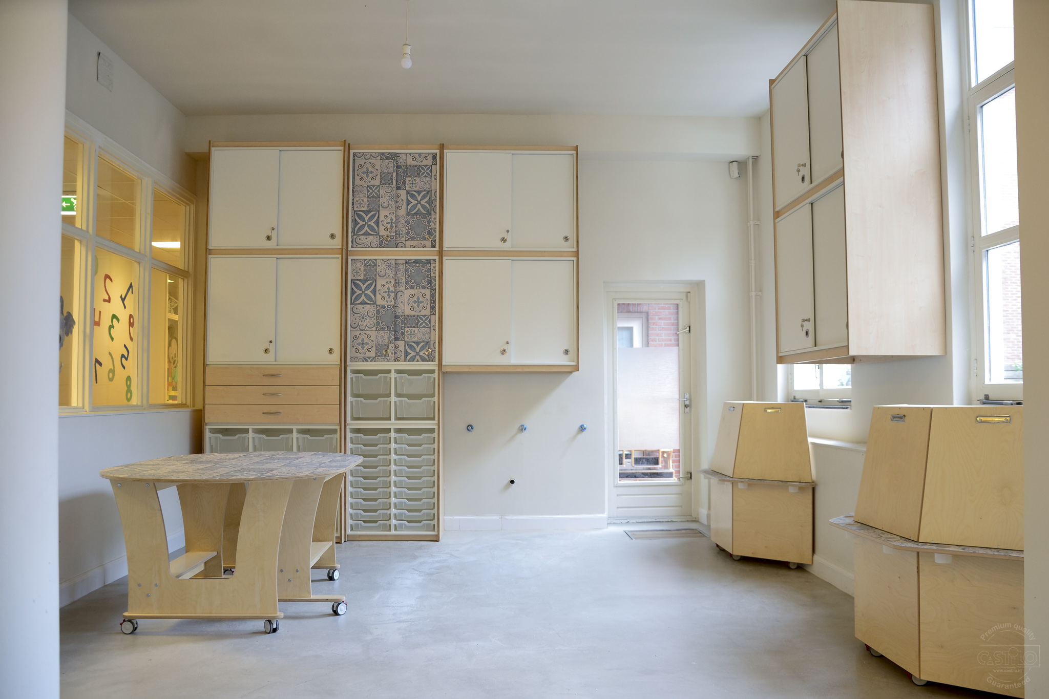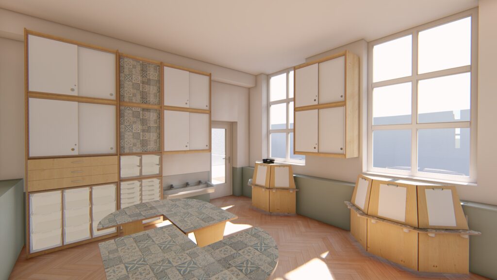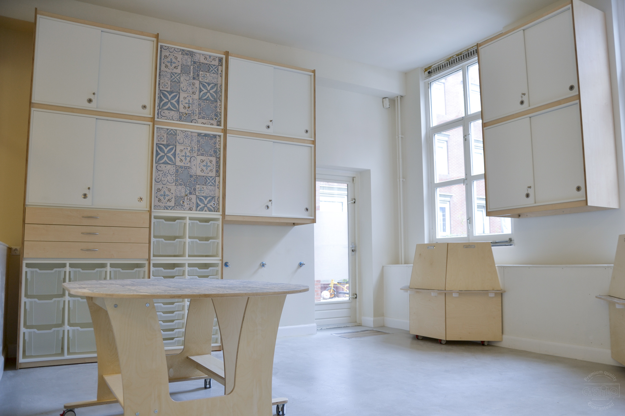Als basis is er gekozen voor berken met wit en blauwe accenten. Hoe leuk is het dat de tafelbladen, diverse kastdeuren en de verfezels een blauw tegelmotief hebben gekregen! Het brengt meteen al sfeer en rust in het gehele ontwerp. Naast het inrichten van een atelier mochten wij ook een speelwerkverdieping en podium plaatsen voor deze klant en dit alles in dezelfde stijl als het meubilair.