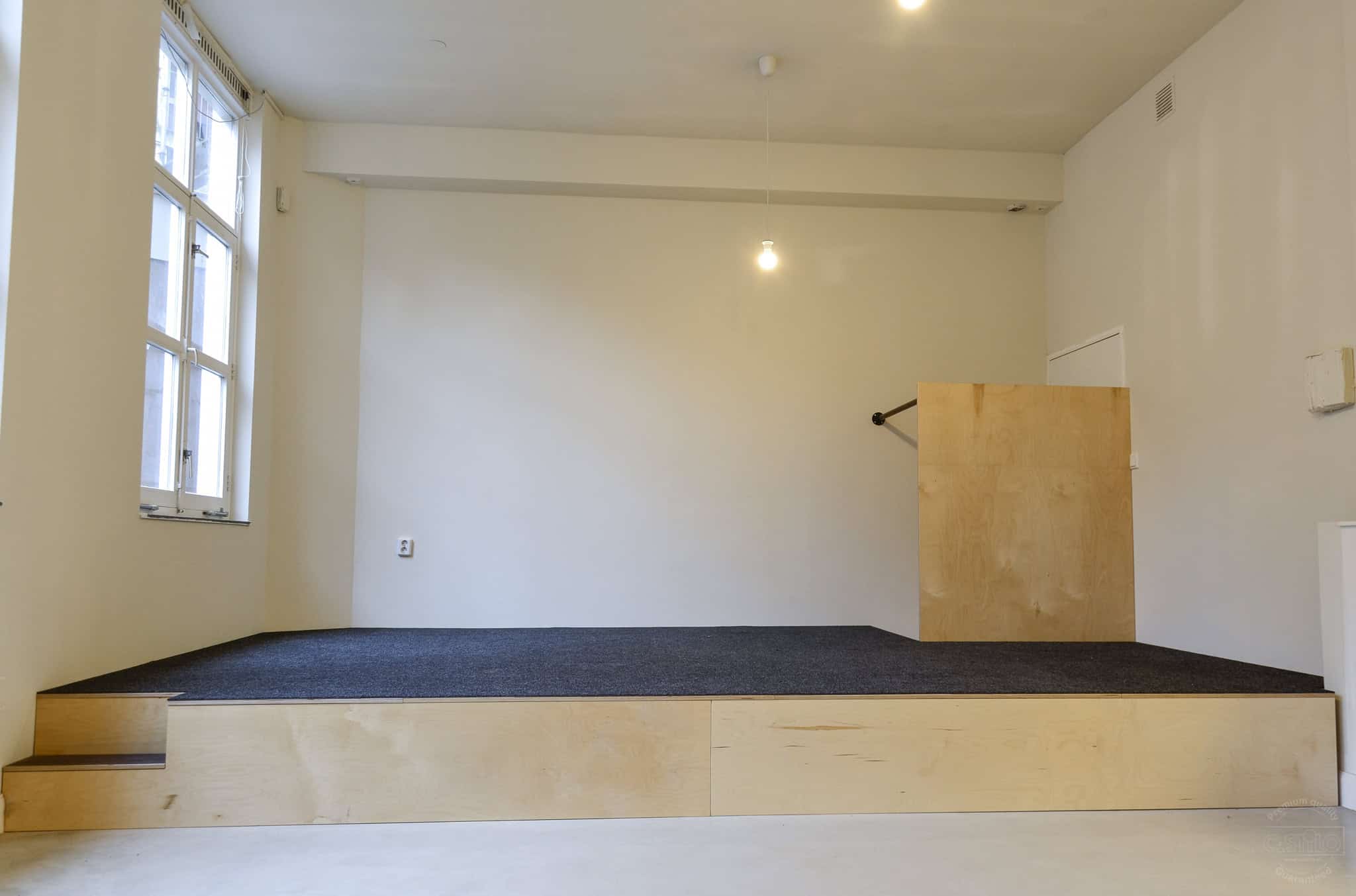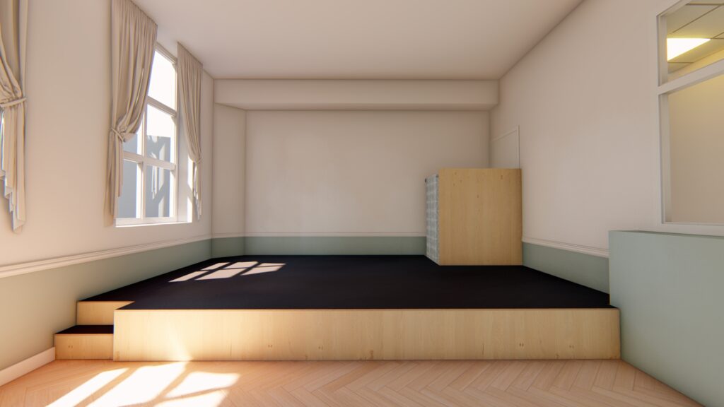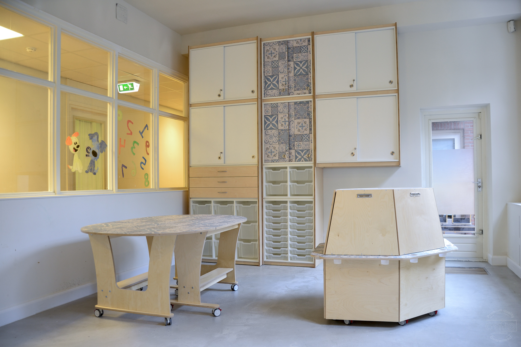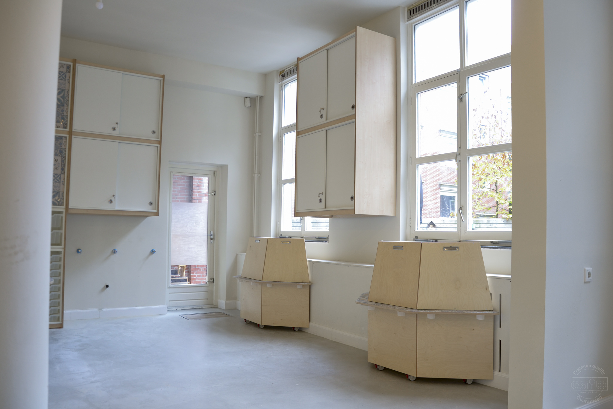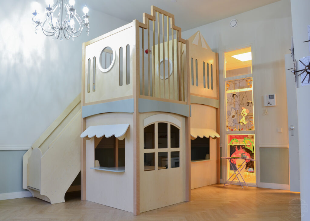 Als basis is er gekozen voor berken met wit en blauwe accenten. Hoe leuk is het dat de tafelbladen, diverse kastdeuren en de verfezels een blauw tegelmotief hebben gekregen! Het brengt meteen al sfeer en rust in het gehele ontwerp. Naast het inrichten van een atelier mochten wij ook een speelwerkverdieping en podium plaatsen voor deze klant en dit alles in dezelfde stijl als het meubilair.